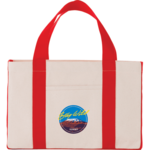 Durable 18 oz. cotton canvas material is perfect for various uses such as groceries, sports equipment, beach gear, or everyday carry. Open main compartment and front slash pocket. 9" drop handles.